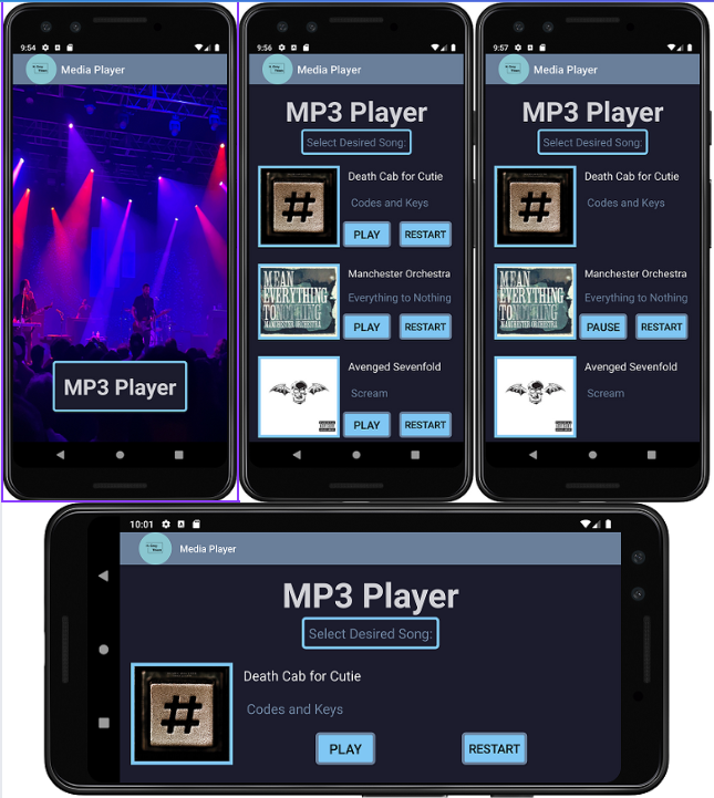 I independently coded and tested this media player app for my Mobile Applications Development Course (LIS4331). I designed the user interface and splash screen in Android Studio, wrote all the Java code for playback controls (play, pause, and restart), and implemented the logic to ensure only one song plays at a time and songs retain their place until restarting. I also handled the integration of the three songs, created a scrollable interface for easier navigation, and thoroughly tested the app to ensure smooth performance.