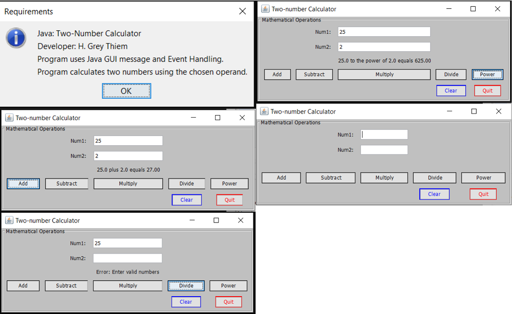 I was responsible for the programming and testing of this calculator. I researched and designed the Java JFrame GUI, wrote the code for basic arithmetic functions, implemented error handling for missing entry, and added clear and quit buttons. I also implemented testing to ensure everything runs smoothly. Overall, I managed all parts of the project independently.